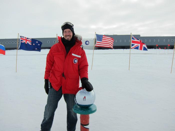 Today will probably be another short post since it’s getting late in the satellite pass. I’ve been outside three times already today — first for a morning jog out to the IceCube laboratory (ICL), then to take the obligatory “hero shots” out at the Pole markers (there is a geographic pole marker, which moves every year as the ice, with the Station and everything else, gradually glides towards some distant oblivion in the Southern Ocean; and the Ceremonial Pole a few dozen meters away which is ringed with the flags of signatories of the Antarctic Treaty). Finally, I went out to meet Mark D., a new collaborator from Belgium who I hadn’t met before. On his plane were half a dozen “DVs” — Distinguished Visitors, which in this case included reporters from the National Science Foundation and National Geographic, which may stroll by here any moment.